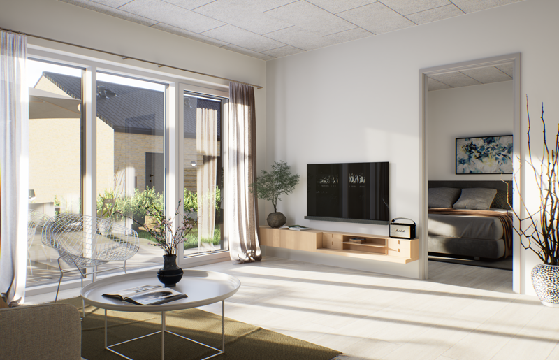Rækkehusene i 1-plan har en gennemsnitlig størrelse på 105 m² med tilhørende carport og skur